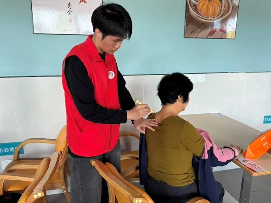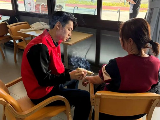 在服务过程中,队员们不仅熟练操作艾灸,为老人们调理身体,更延伸服务内涵,巧妙融入中医养生知识科普、个性化健康咨询以及舒缓疲劳的推拿按摩。他们耐心倾听老人诉求,细致解答健康疑问,用专业的知识和真诚的陪伴,赢得了老人们的连连称赞与灿烂笑容。活动现场始终洋溢着温馨融洽的氛围,充分展现了学院学子良好的精神风貌和扎实的专业功底。