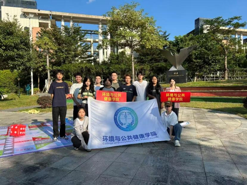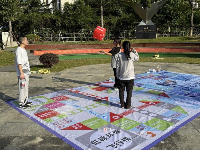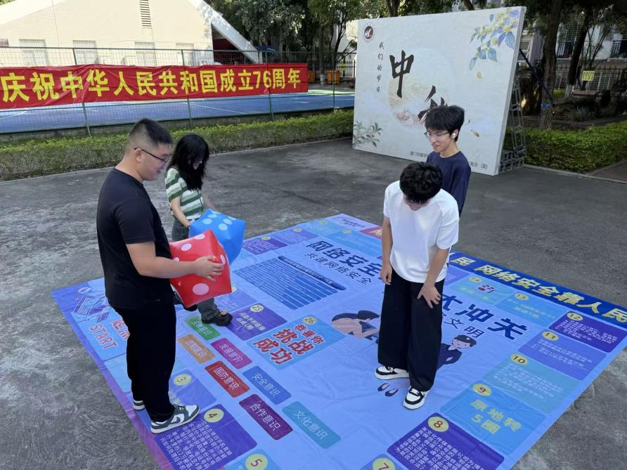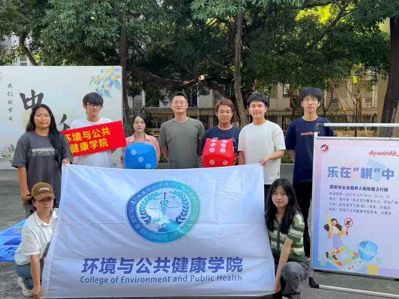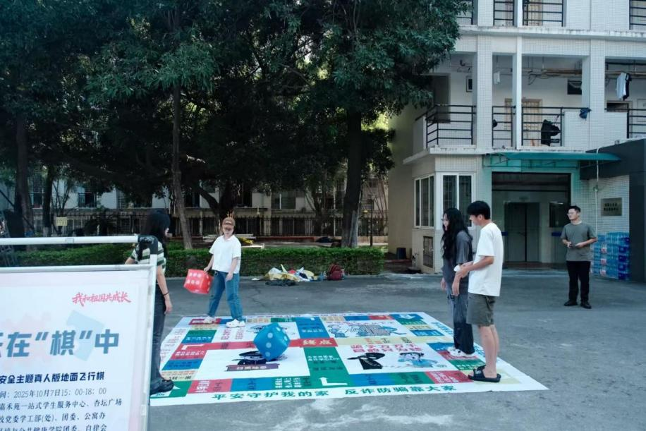 为庆祝中华人民共和国七十六周年华诞,涵养家国情怀、筑牢国家安全基石,深入学习宣传国家安全教育,深化大学生国家安全意识,环境与公共健康学院于2025年10月7日下午在嘉禾苑一站式学生服务中心、杏坛广场举办乐在“棋”中——国家安全主题真人版地面飞行棋活动。