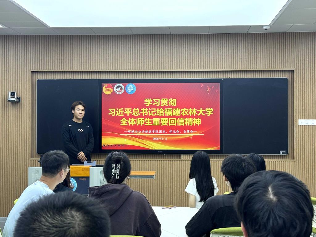 习近平总书记给福建农林大学全体师生的回信,饱含对青年一代的深切关怀与殷切期望。作为环境学院学生干部,我深感这是对青年学子,尤其是对环境学子的巨大鼓舞与行动号令。我们当引领同学将个人成长融入农业强国建设大局,发挥专业优势搭建实践平台,带动更多学子深耕绿色食品研发、生态种养技术推广等实践,以专业所学践行“从农田到餐桌”的健康守护与生态责任,为乡村振兴、生态文明建设贡献青年智慧与力量。