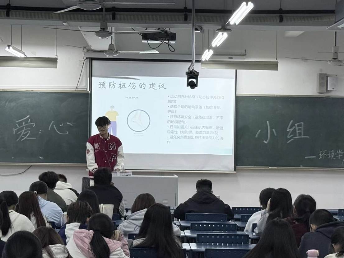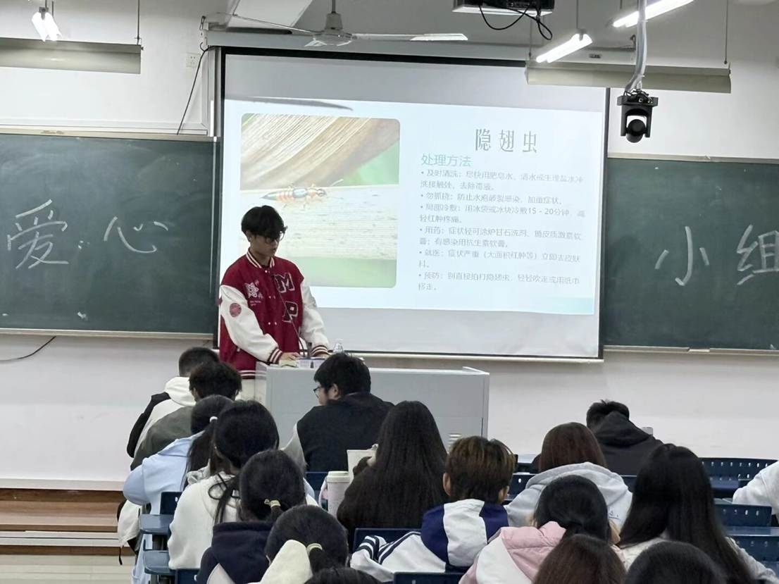 本次课程由环境与公共健康学院生活部副部长陈飞扬主讲,内容涵盖野外兽虫叮咬防护、出行扭伤处理以及互动问答三大环节。