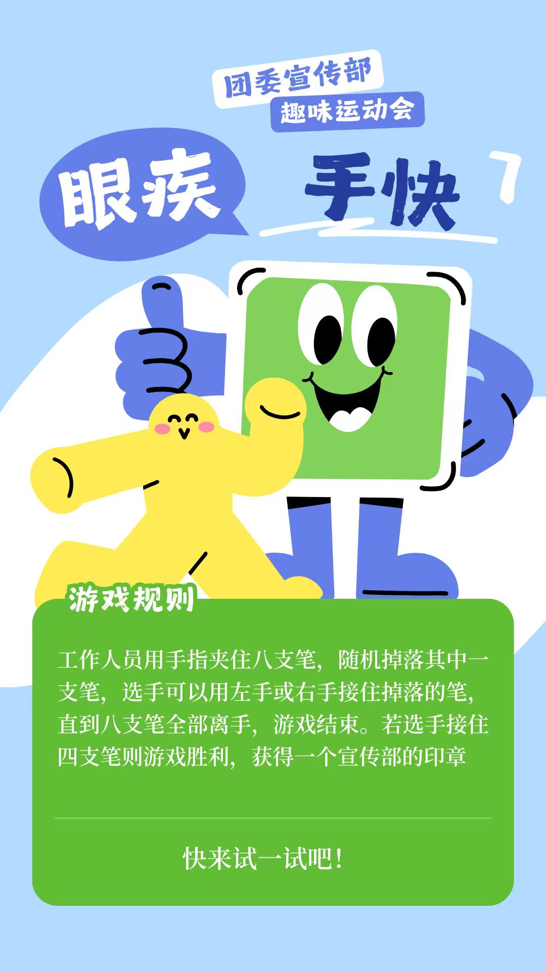 干事或者同学两两组队一个人比划一个人猜,单人挑战猜5个,双人挑战猜3个单人挑战限时2分钟,双人挑战1分半。