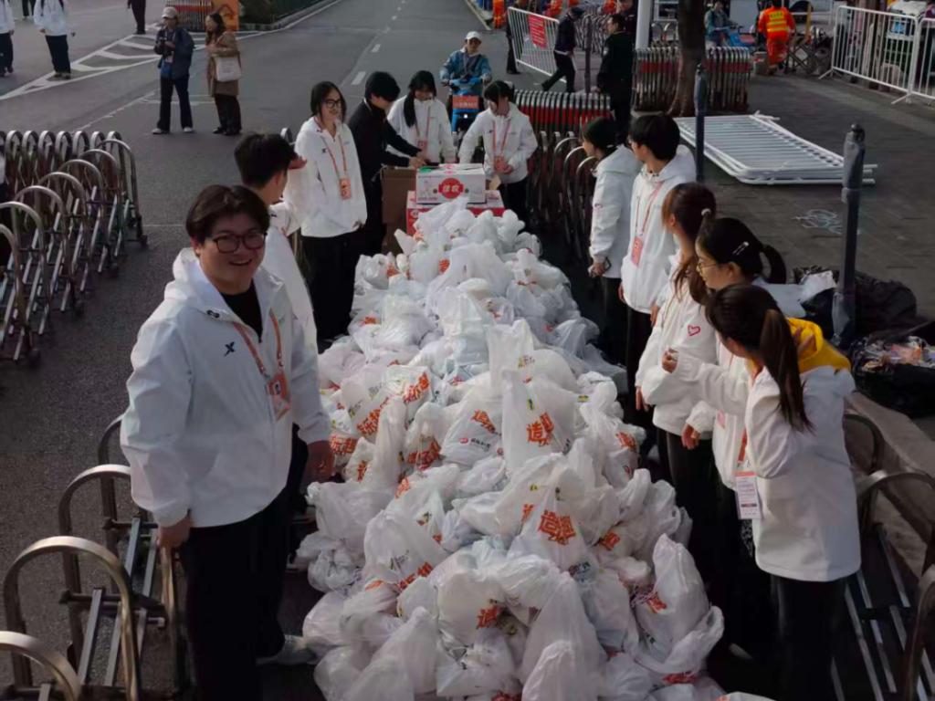 天刚蒙蒙亮,物资发放点的晨光还裹着凉意。志愿者们在堆成小山的物资旁忙碌,将香蕉、奖牌、运动饮料逐一装至物资包。当第一波完赛选手靠近,志愿者们早已站成整齐队列,手中稳稳攥着备好的物资包。每一句“恭喜完赛”都饱含对选手的真诚祝福,这份忙碌无轰轰烈烈的瞬间,却尽显志愿的温暖。这份温暖藏在赛前每一次认真的准备中,藏在物资堆旁,藏在每一个俯身的细节里。