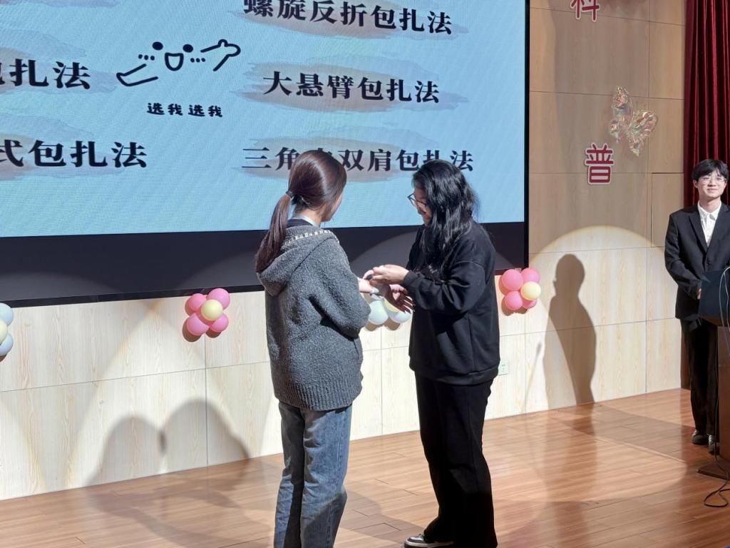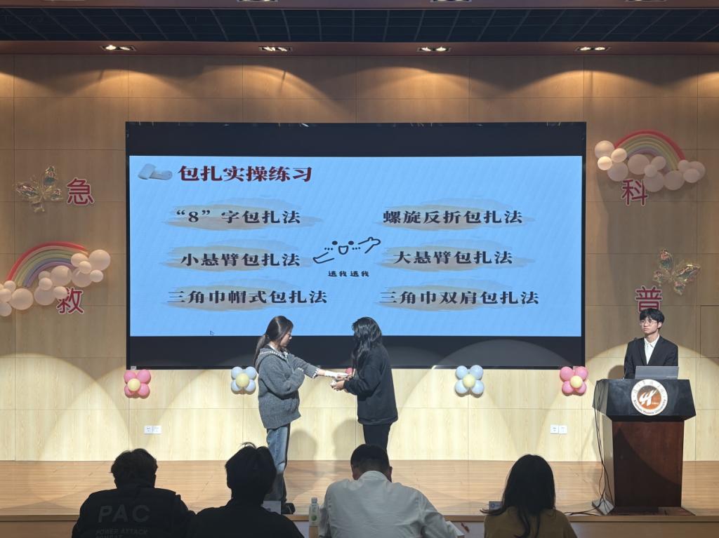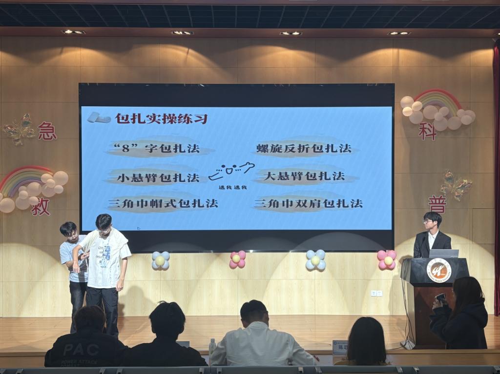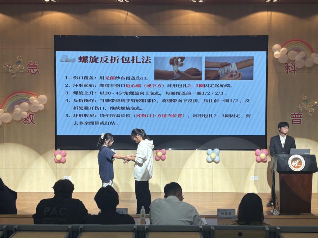 活动还设置了观众上台实操环节。通过现场练习,同学们在动手实践中巩固了止血与包扎的操作要点,进一步掌握了相关技能。