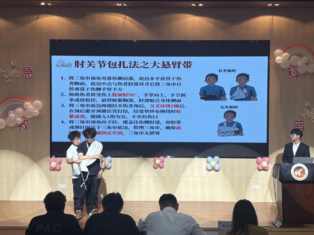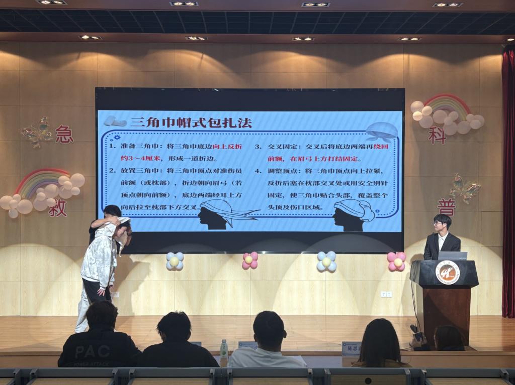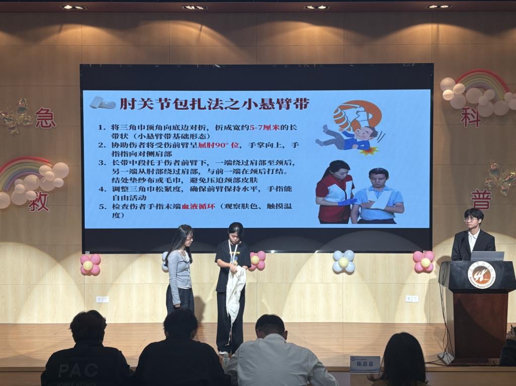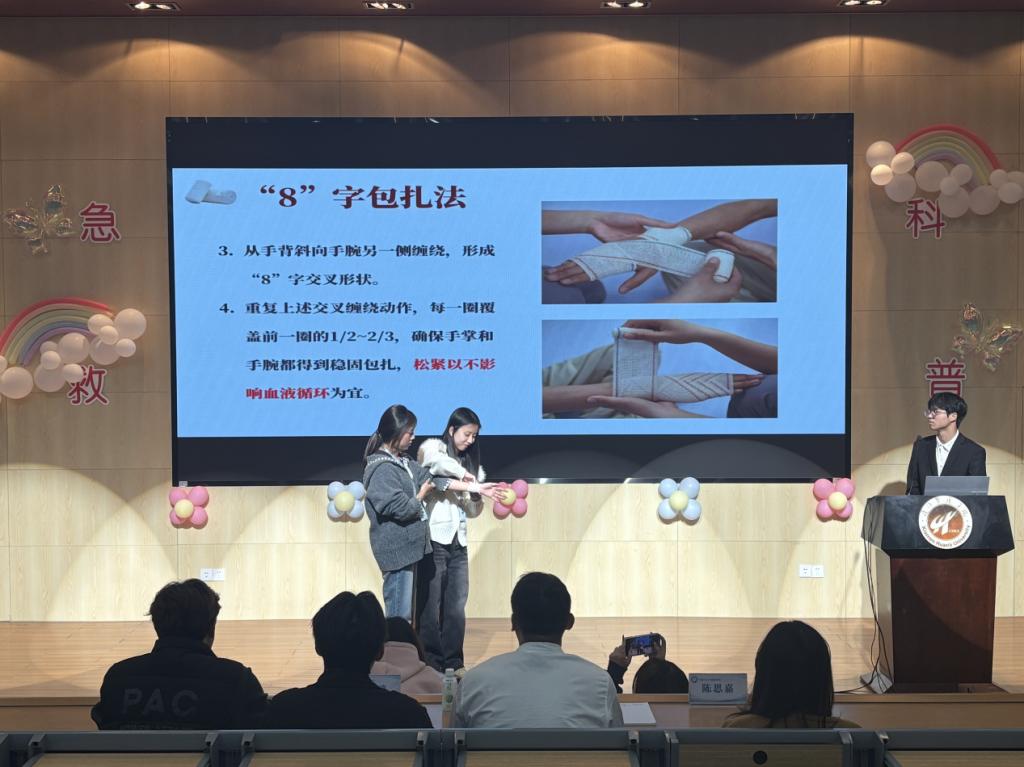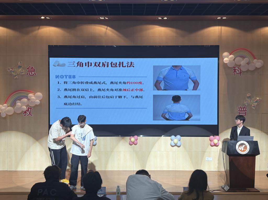 活动还设置了观众上台实操环节。通过现场练习,同学们在动手实践中巩固了止血与包扎的操作要点,进一步掌握了相关技能。