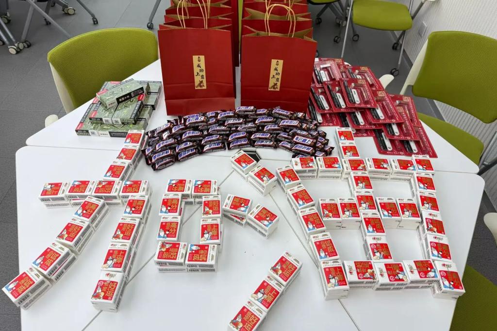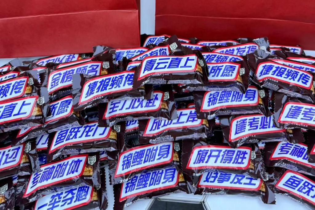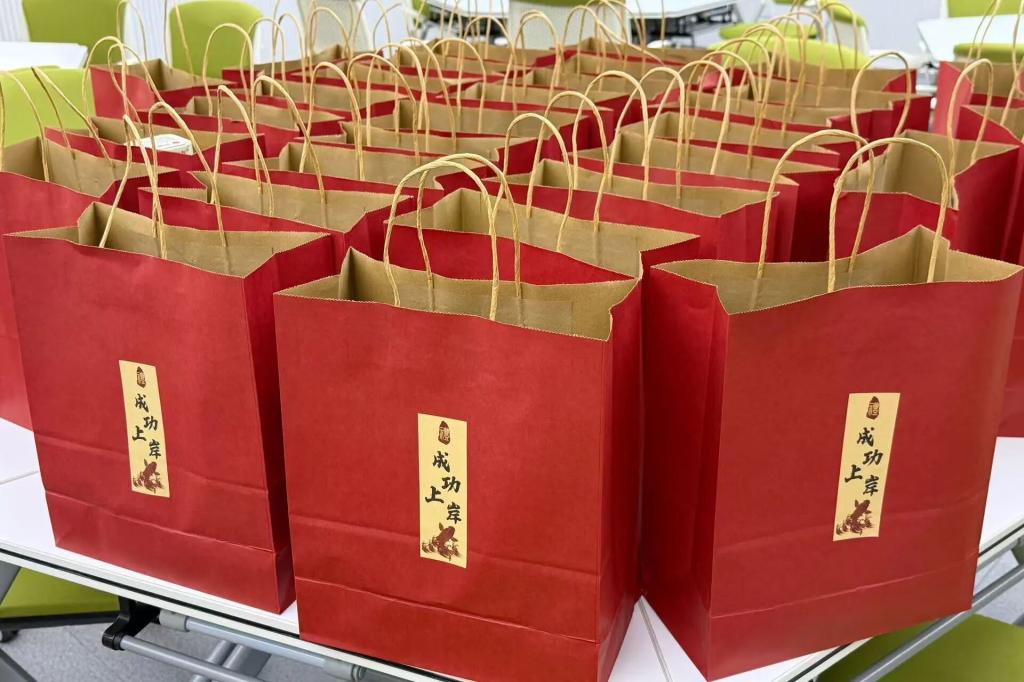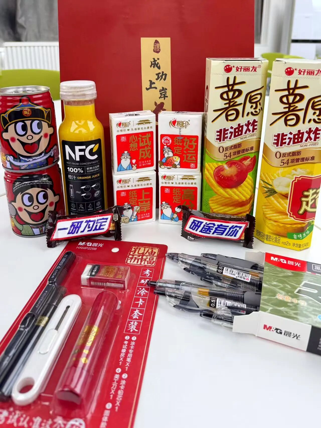 礼轻情意重,细节见真心。学院为考研学子准备的“暖心礼包”别具巧思,每一件物品都寄托着美好的祝愿:“橙汁”寓意“心想事‘橙’”,期盼学子们如愿以偿;旺仔牛奶象征着“运气旺旺”,助力考场发挥顺遂;定制的考研主题士力架意在为学子“补充能量,聚力冲刺”;实用的文具袋与考试用笔则为学子们的实战提供了贴心保障。这份精心搭配的礼包,不仅考虑了备考冲刺期的实际需求,更融入了全院师生对考研学子旗开得胜、金榜题名的殷切期盼。