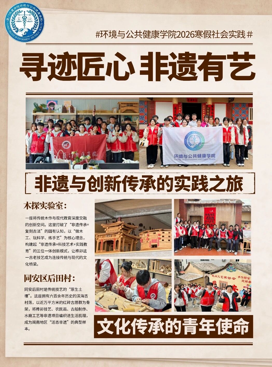 2026年1月15日,厦门华厦学院环境与公共健康学院“循迹匠心,非遗有艺”实践队在团委书记徐玉清、学生会指导老师蒋依玲的带领下以青年之眼洞察传统,以实践之力探寻活化,走进木探实验室解码榫卯的科技基因;探访同安后田村,触摸古厝的文化脉搏,在“技艺研学+田野调查”的双轨实践中,勾勒出非遗从“活起来”到“火起来”的现代转型图谱。