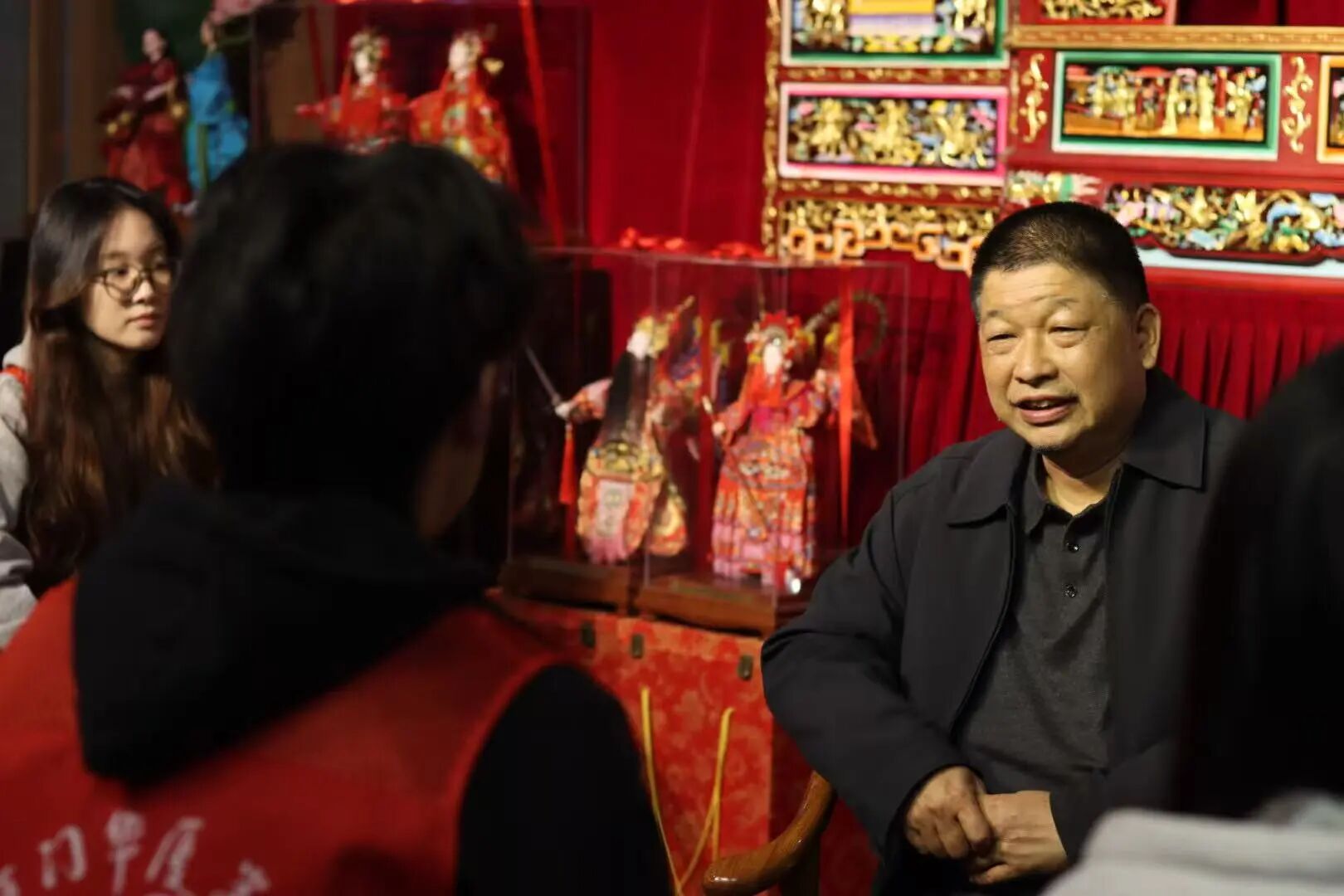随后,实践队邀请到徐氏木偶雕刻第七代传人徐强老师与队员们进行面对面的深入交流。他从魏晋南北朝的技艺雏形为切入点,详细梳理了布袋木偶戏从街头“扁担戏”到剧场艺术的千年发展脉络,分享了徐氏家族二百余年坚守传承的历程。