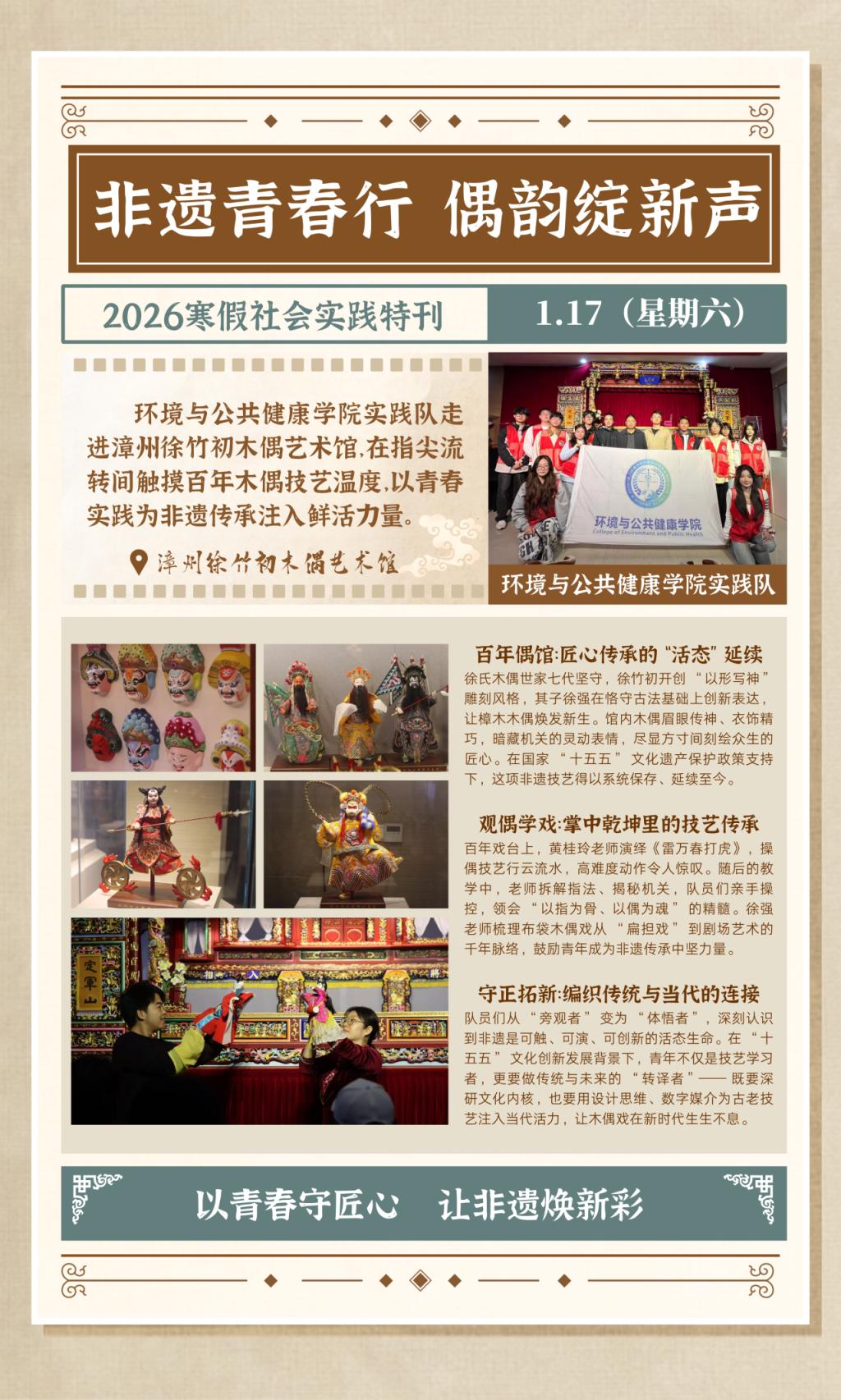 文化兴则国运兴,文化强则民族强,传承创新青年有责。当前我国正深入实施“十五五”规划,强调文化遗产的系统性保护与创新性发展。2026年1月17日,厦门华厦学院环境与公共健康学院“芗偶传情,戏韵承芳”实践队在团委书记徐玉清、自律会指导老师赵泽式的带领下赴漳州徐竹初木偶艺术馆进行社会实践活动。