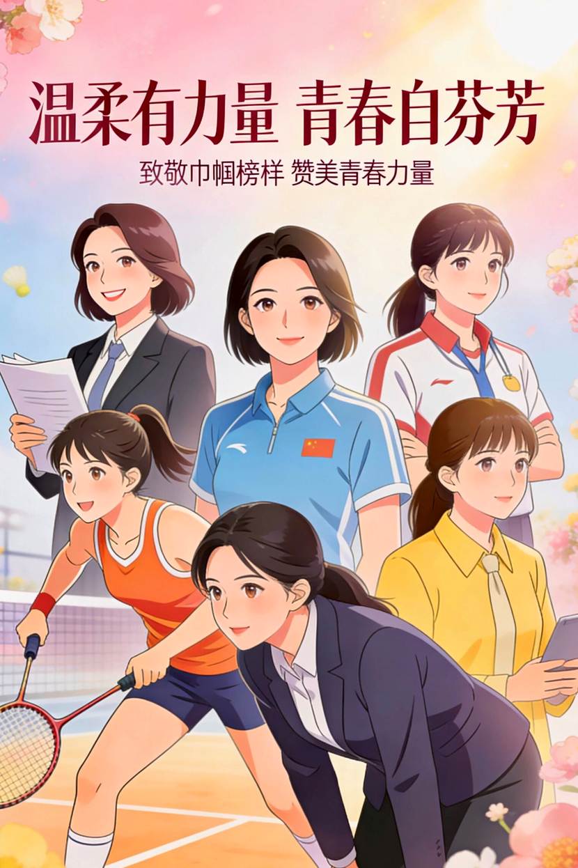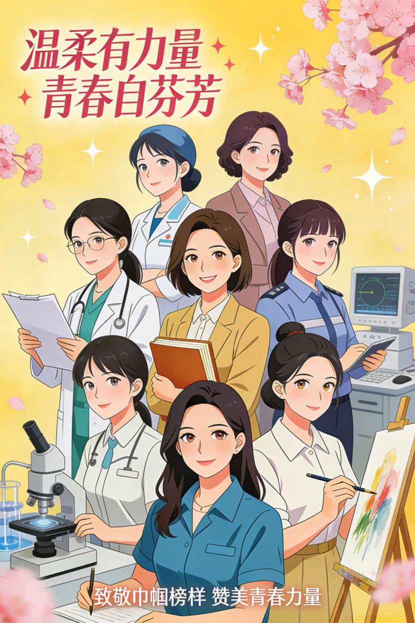 以动漫笔触勾勒青春女性形象,将温柔与力量融于画面。色彩明快灵动,凸显新时代女性自信坚韧的多元魅力,致敬巾帼榜样的同时,展现当代女大学生的青春朝气。贴合本次主题,彰显新时代女性独有的风采与力量。