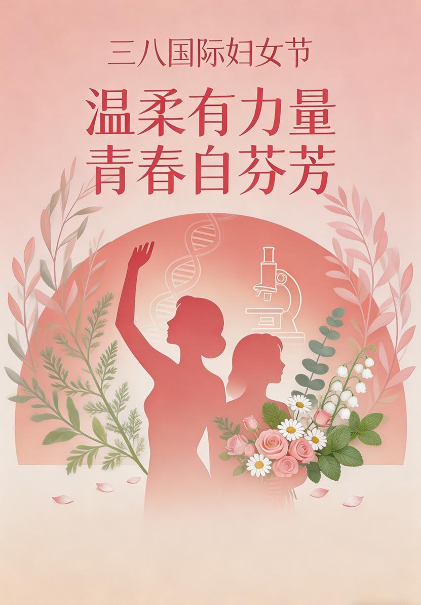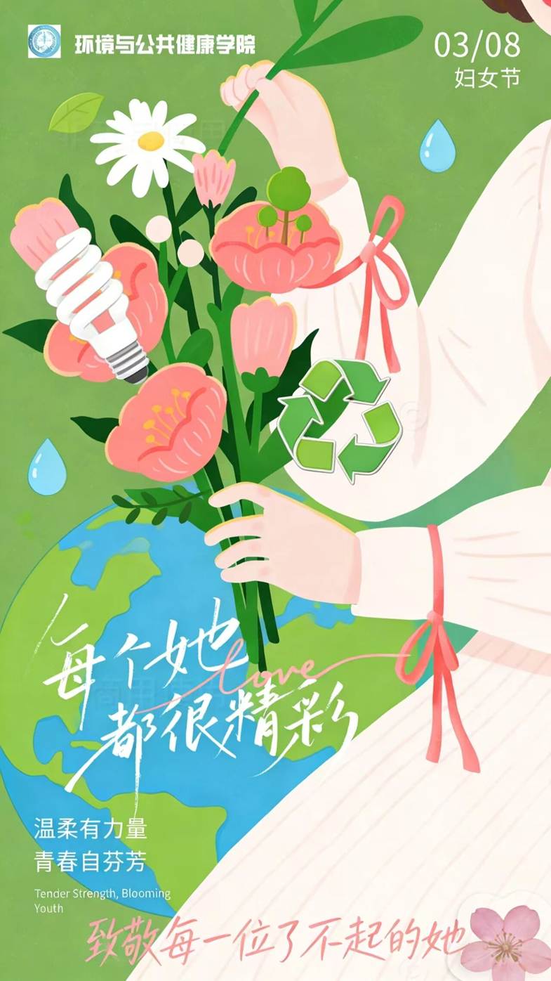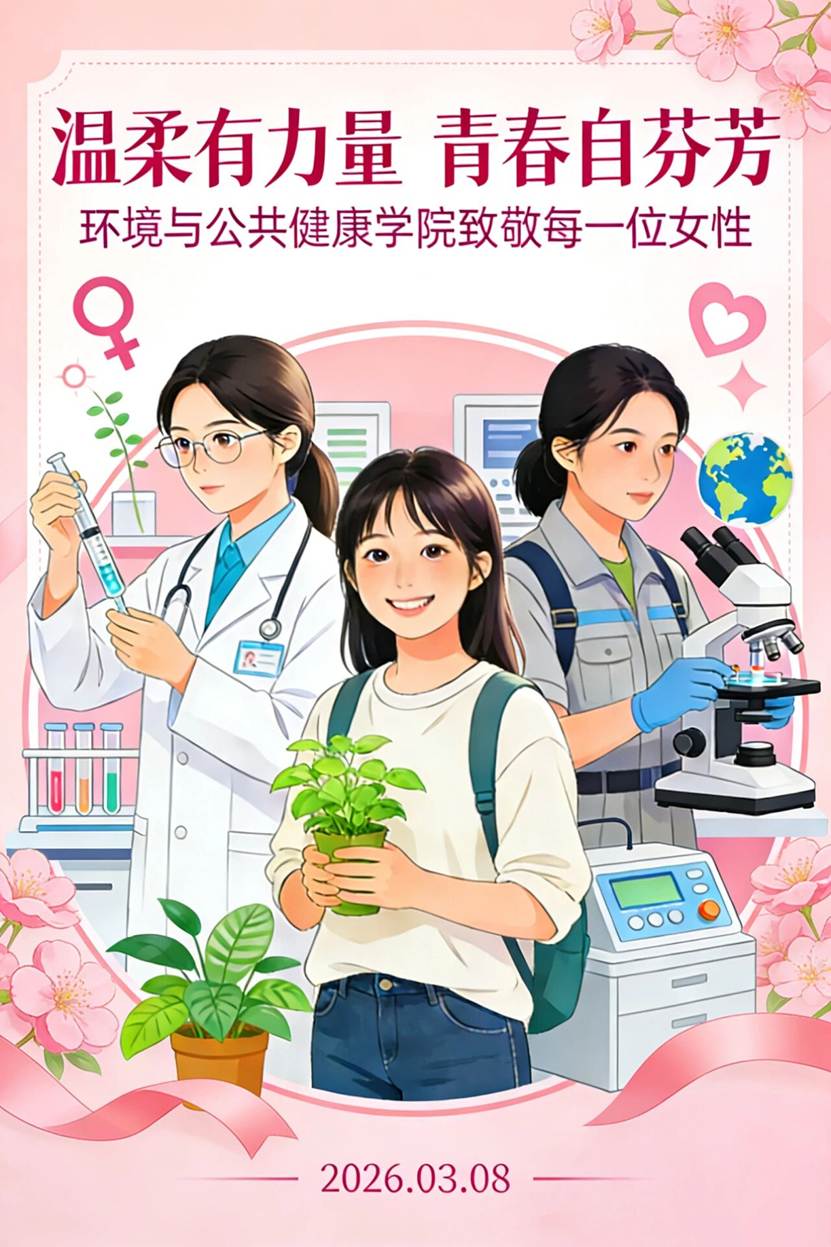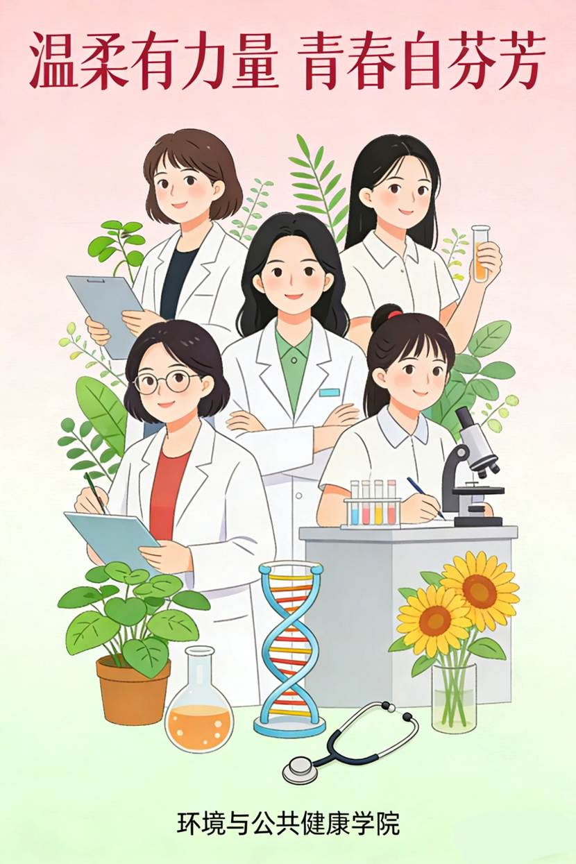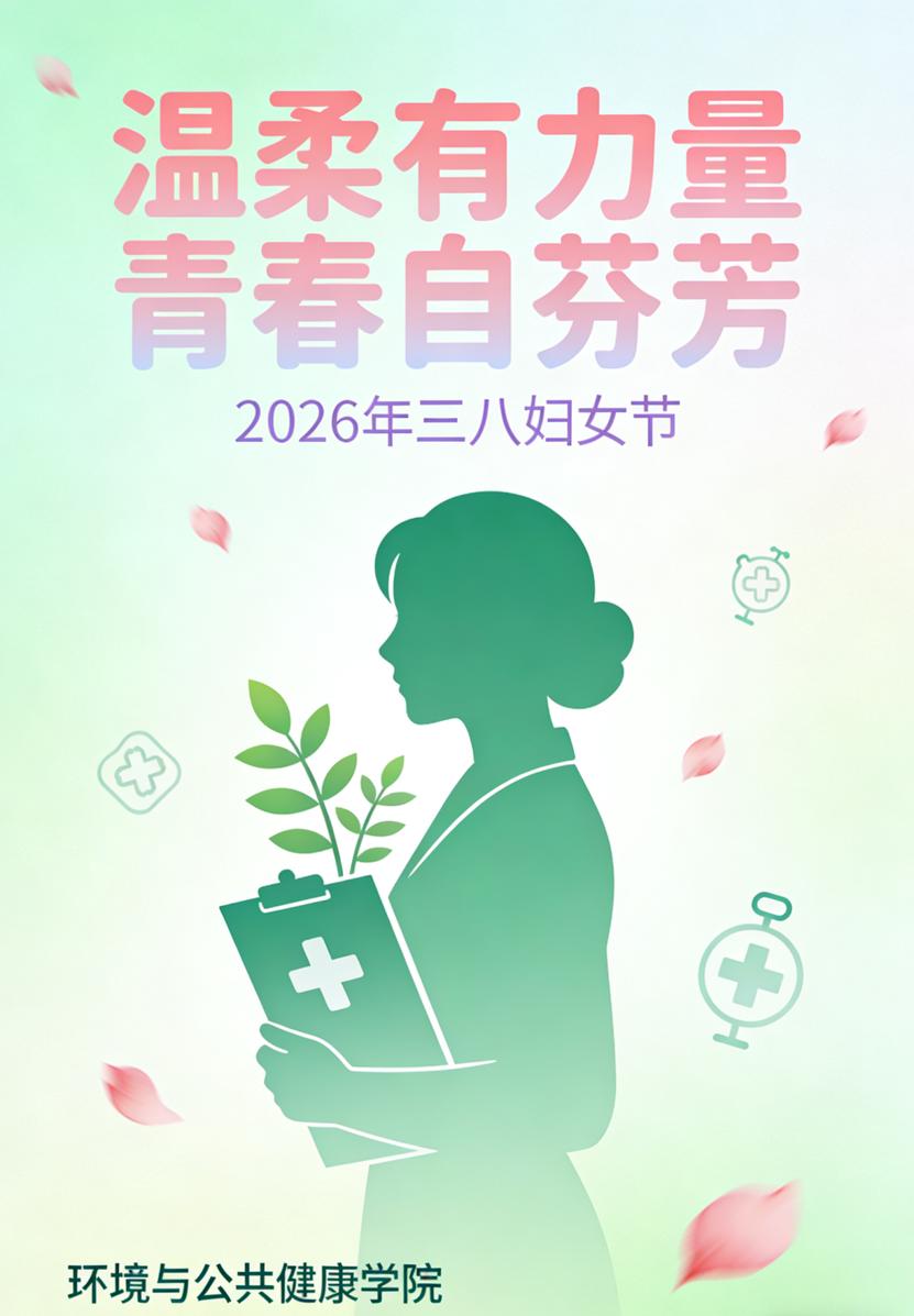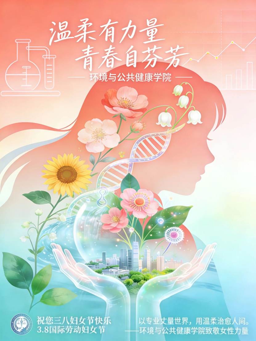 该海报以“温柔有力量,青春自芬芳”为核心,将环境与公共健康学院的元素(显微镜、DNA双螺旋、植物枝叶)与女性剪影、鲜花意象融合,既体现女性的柔美坚韧,又彰显学院师生在公共健康领域的专业担当,传递出女性力量与专业使命共生共荣的理念。
