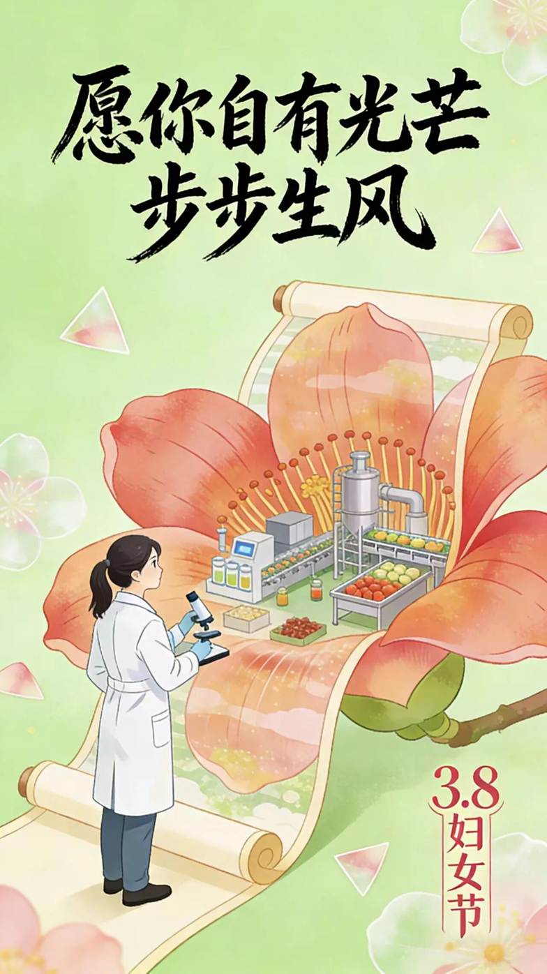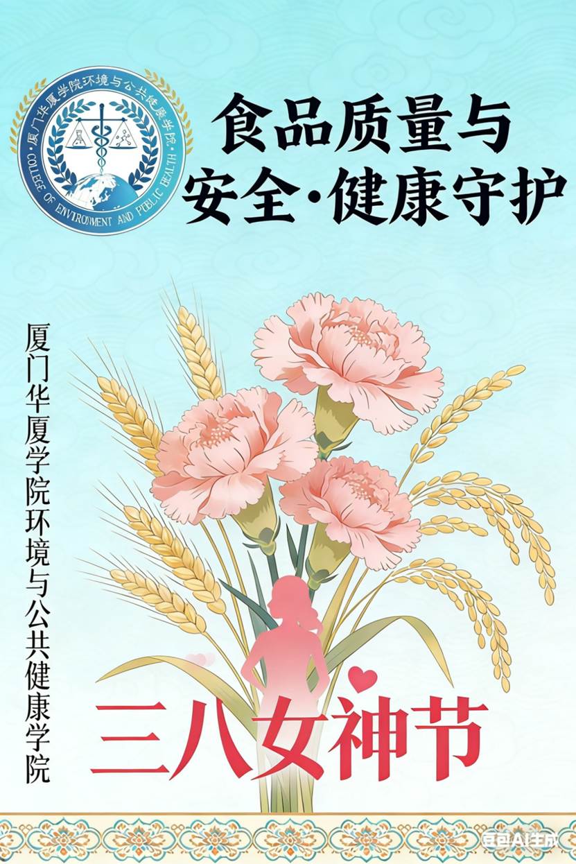 这张海报以国风美学为基底,用康乃馨象征食品质量与安全专业的守护初心,麦穗与稻穗寓意“民以食为天”的根本。融入院徽与女神节元素,既彰显专业严谨,又传递对女性从业者的敬意,展现守护公众健康的使命担当,彰显学院专业温度与人文关怀。