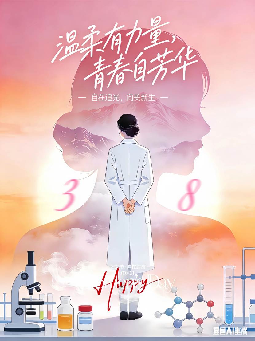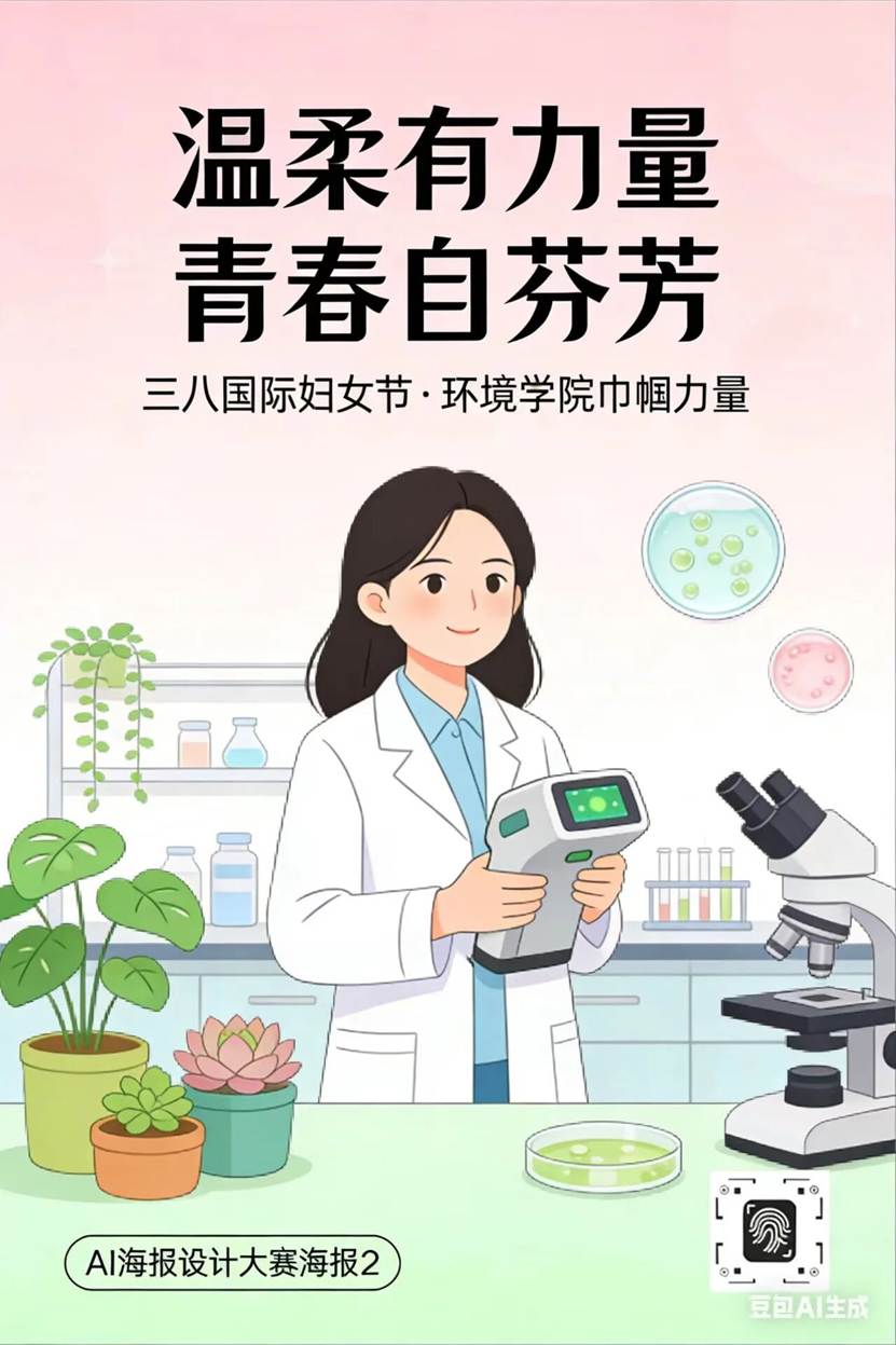 海报紧扣“温柔有力量 青春自芬芳”主题,结合环境与公共健康学院特色,以柔粉渐变色调传递温暖,将女性科研工作者、青年学子形象与绿植、实验仪器融合,展现女性独立坚韧的多元魅力,致敬巾帼榜样,传递青春正能量。