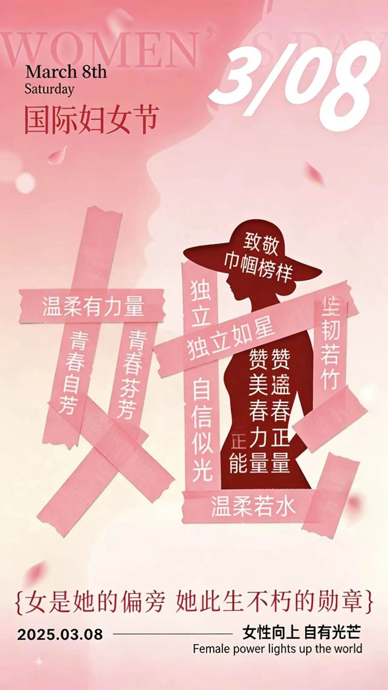 本海报以“温柔有力量 青春自芬芳”为核心,用浅粉渐变营造春日氛围。以女性侧脸剪影搭配樱花,象征女性柔美与坚韧并存的特质;融入女科研工作者形象,致敬巾帼榜样,传递“唯有你,可以定义自己”的独立精神,借三八妇女节赞美女性多元魅力,传递温暖正能量。