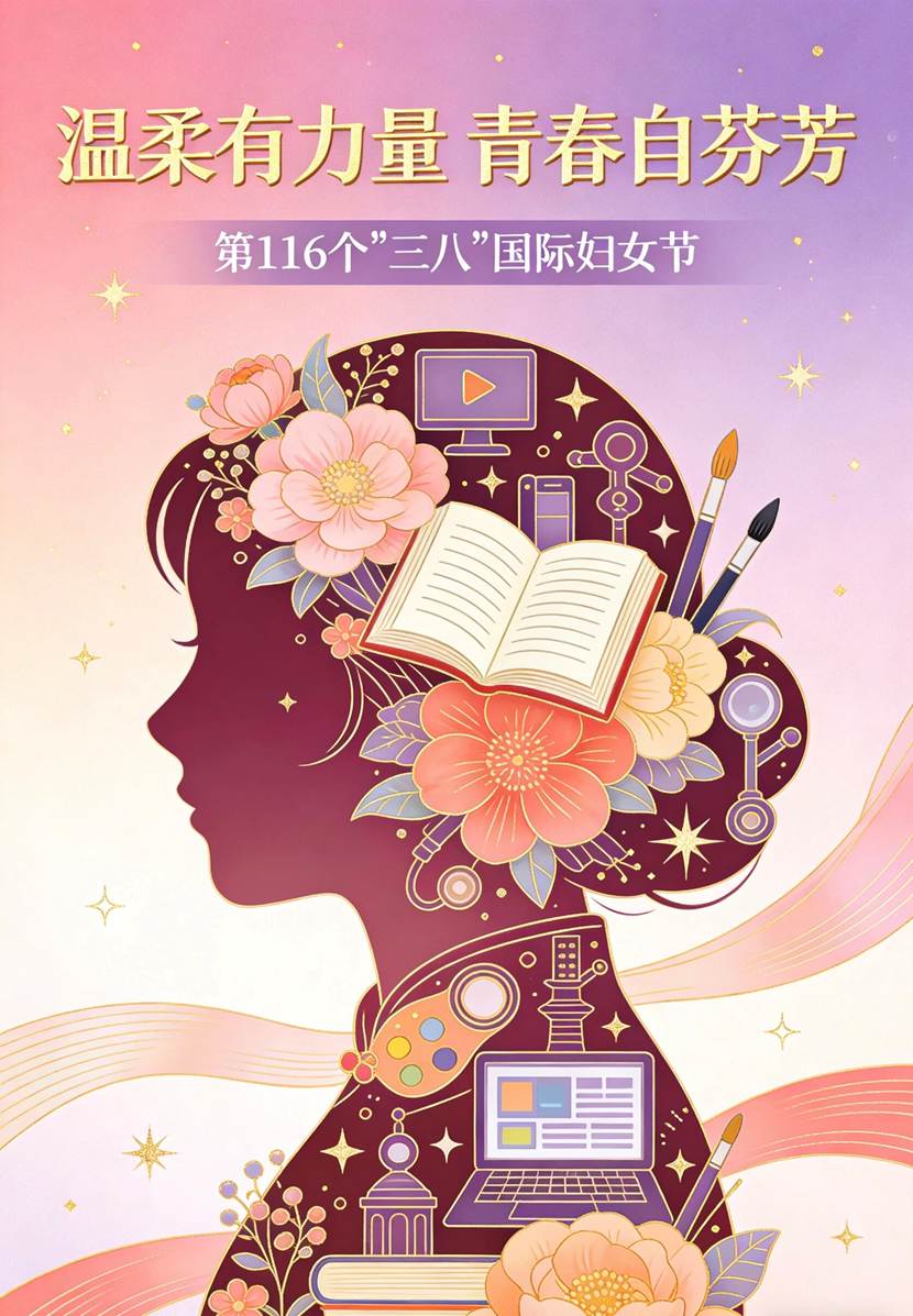 这张海报以女性剪影为载体,将花朵、书本、画笔、电脑等元素巧妙融合,象征着新时代青年女性兼具温柔与力量。渐变的粉紫背景与金色线条,传递出青春的活力与希望,致敬每一位在专业领域发光发热的女性,彰显“温柔有力量,青春自芬芳”的时代精神。