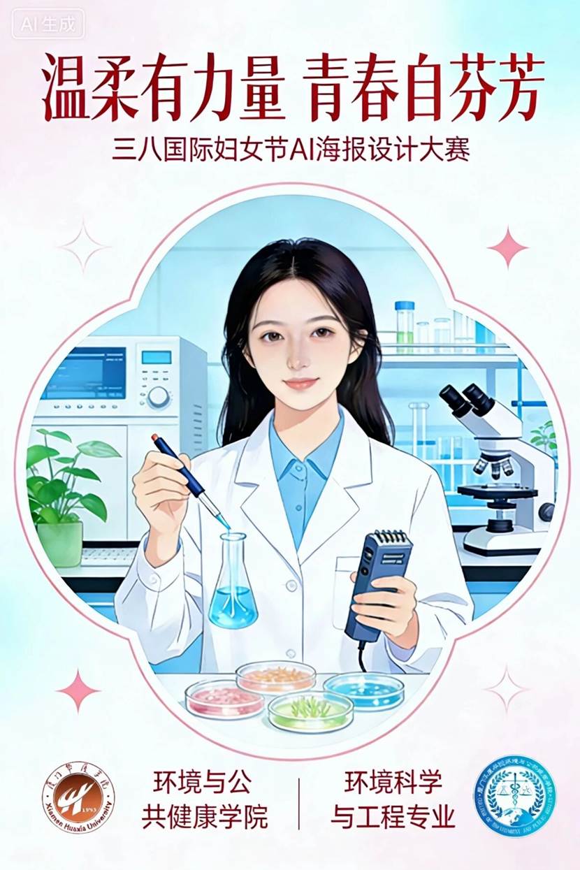 海报以实验室场景为核心,身着白大褂的女生手持移液管与检测设备,专注操作培养皿,融合环境科学与工程专业特色。搭配厦门华厦学院及环境与公共健康学院院徽,传递专业归属感。整体色调清新柔和,既展现女性科研工作者的温柔气质,又凸显其守护环境与公众健康的坚韧力量,呼应“温柔有力量 青春自芬芳”的大赛主题。