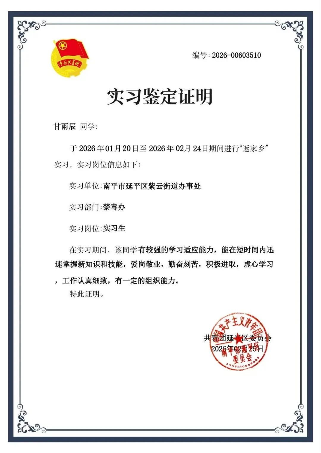 在南平市延平区紫云街道办事处禁毒办的一个月实习中,我作为综合岗实习生,深度参与了基层禁毒宣传与社区服务工作。实习期间,我协助整理了辖区内禁毒宣传活动的台账资料,包括活动方案、照片归档和总结报告,确保了工作记录的规范与完整。我还参与了社区禁毒宣传活动,协助发放宣传手册、布置活动场地,并向居民讲解毒品危害及预防知识。通过这些实践,我不仅熟悉了基层行政工作的流程,也深刻体会到禁毒工作的重要性,将专业知识与实际工作相结合,提升了自身的沟通协调与问题解决能力。
